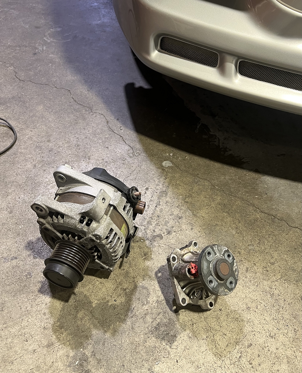 オルタネーター交換ですが、15万キロ走行しているので中古で対応しました。