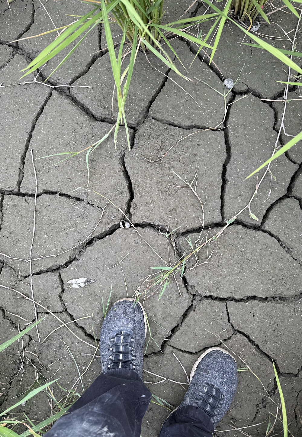 かなりひび割れがひどい、隣の田んぼはみずがたまってます