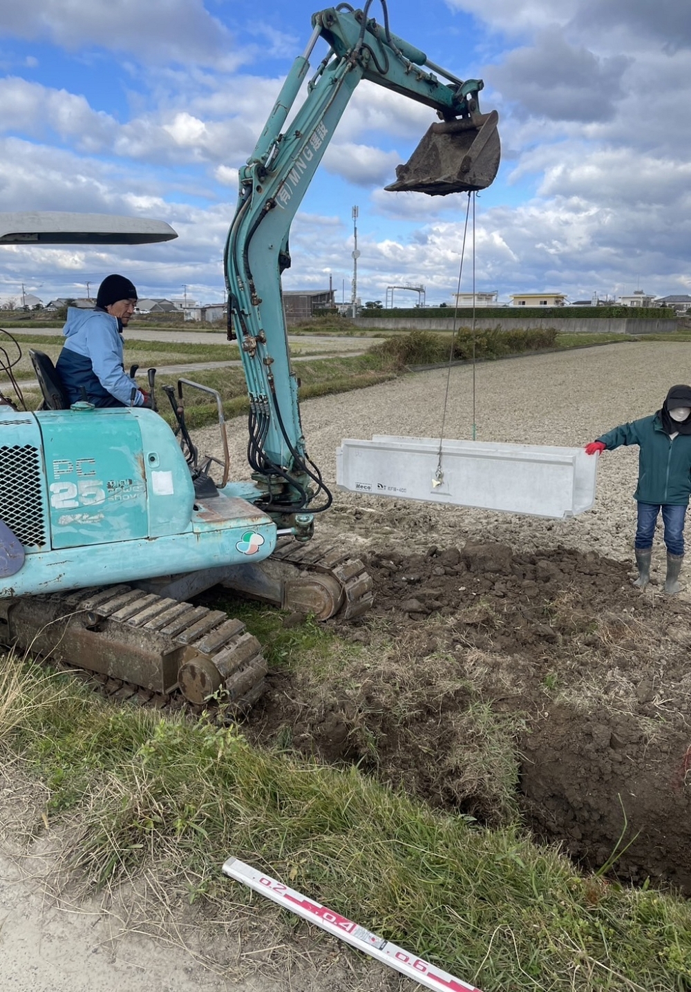 水路工事を3人でやってます。